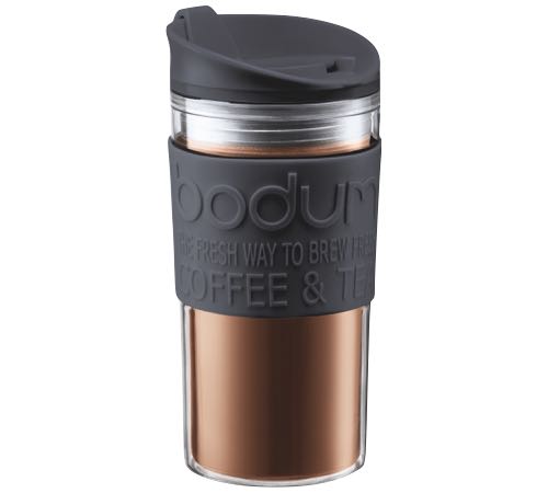 The Bodum Travel Mug allows you to keep your drink warm for 1 hour and cold for 2 hours. Ideal for the office or short trips. Double-wall strong plastic (BPA-free). The lid has a flip-opening sipping part. Handy silicone band for a better grip and to prevent burns. 35cl (350ml) capacity.