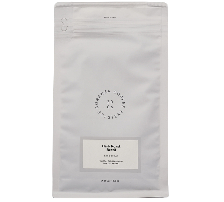 Discover Dark Roast Brazil coffee beans, a dark roast from Bonanza Coffee in Germany. This specialty coffee reveals rich, spicy aromas thanks to its dark roast: cocoa, sweet spices, and roasted almonds. Perfect for manual or automatic espresso machines, it produces a perfect extraction for an intense espresso. Available in 250g packages.