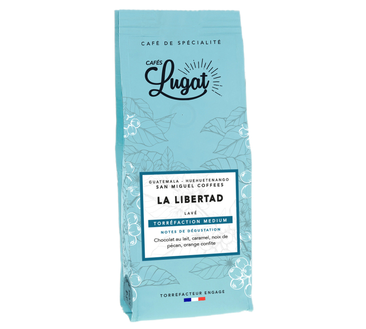 Guatemala La Libertad coffee beans, roasted in France by Cafés Lugat, is a single-origin coffee from the Huehuetenango region of Guatemala. It is made from the Bourbon, Caturra and Catuai varieties, grown at an altitude of 1900 metres on the San Miguel Coffees farm. This washed Arabica coffee will win you over with its medium roast and rich, fruity profile. In espresso, it reveals notes of milk chocolate, caramel, pecan and candied orange. 250g pack.