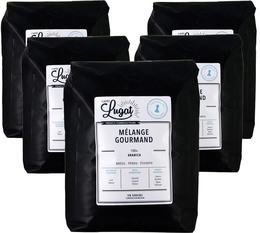 'Mélange Gourmand' is a blend of 100% Arabica from Brazil, Ethiopia & Peru. A real treat as an espresso to unleash its sweet notes of cocoa and praline! Assembled & roasted by Cafés Lugat in France. Balanced intensity. Medium roast. 5 x 2kg coffee beans. Ideal for cafés, bars & restaurants. Free delivery.