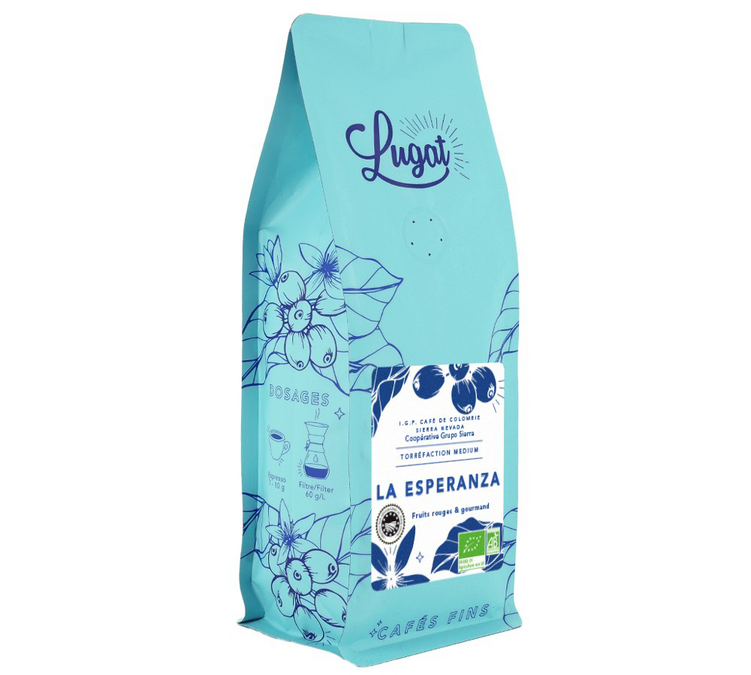 La Esperanza coffee beans are grown on the Granja La Esperanza family farm, located in the south west of Colombia, in the Cauca Valley. 100% organic Arabica. For a balanced coffee with notes of berries (mainly blackcurrant). Specialty coffee. Roasted in France. 4 x 250g packs.