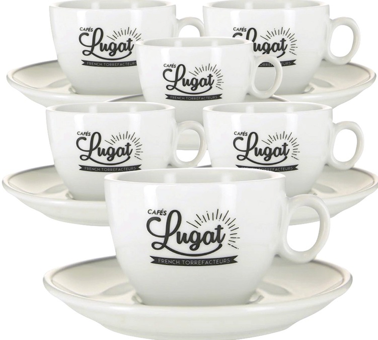 Cafés Lugat set of 6 porcelain cappuccino cups and saucers. 17.5 cl capacity. Imagined by our Barista experts to have the perfect capuccino experience. They are shock resistant and perfect to obtain the best crema!