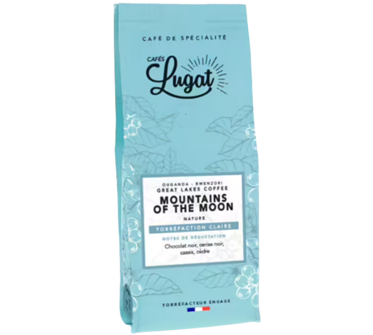 "Mountains of the Moon" coffee beans from Cafés Lugat : a terroir coffee grown on the foothills of Mount Rwenzori in Uganda, near the Congo border. For a strong coffee with notes of dark chocolate, passion fruit and apple. 250g coffee beans. Specialty coffee roasted in France.
