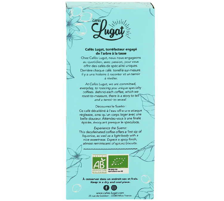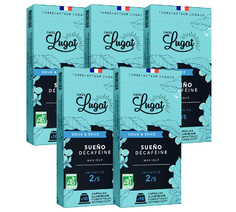 Enjoy these Sueño Decaf Nespresso* Original compatible capsules from Lugat. This spicy and gourmet decaffeinated blend, organically grown and originating from Mexico, is designed and roasted in France with freshness and quality as its leitmotiv! Packaged in a box of 10 capsules, 100% aluminium to preserve freshness and the environment. Pack of 50 capsules. Capsules compatible with Nespresso* Original machines.