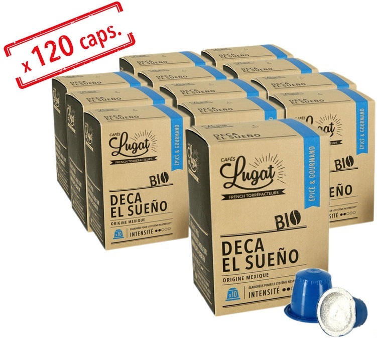 "El Sueño" Nespresso-compatible capsules by Cafés Lugat. A water-decaffeinated coffee (no solvents). From organic coffee grown in Mexico. For a mild coffee with sweet notes of Speculoos biscuits and spices. 12 boxes of 10 capsules. Ideal for offices & small businesses wanting to offer a decaffeinated option.