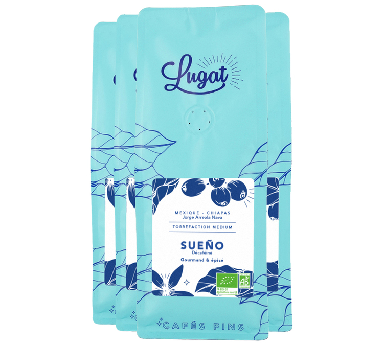 Sueño by Cafés Lugat is a water-decaffeinated coffee. These organic coffee beans are grown in the Altura region of Mexico. For a mild coffee with sweet notes of Speculoos biscuits and spices. 4x 250g packs of coffee beans.