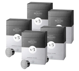 Pack of 120 Cafés Richard Premium Intense N°3 capsules for Cafés Richard Ventura machines. Intense N°3 is a subtle balance between finesse, strength and fullness. Made from high altitude coffees for intense flavours. A hint of Robusta supports its body and character. 5 boxes of 24 capsules.