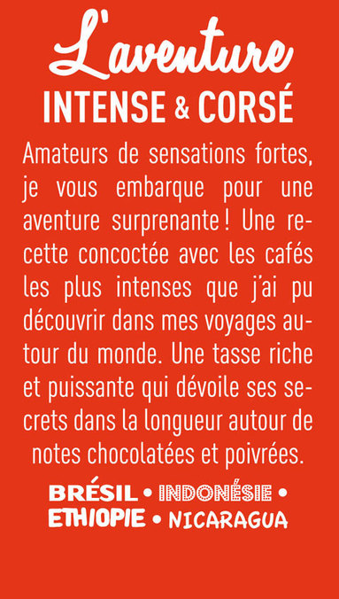 'L'Aventure' is a blend of grands crus Arabica coffee beans from Brazil, Indonesia, Ethiopia & Nicaragua. For a strong coffee with a beautiful chocolatey & peppery aftertaste. Assembled and roasted by French artisan roasters Cafés Tchanqué. 250g coffee beans.