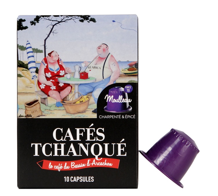 "Moulleau" capsules by Cafés Tchanqué: a blend of Arabica & Robusta (Brazil, Colombia, India). For a strong espresso with spicy notes. Artisan roast. Made in France. 10 Nespresso* Original compatible capsules.