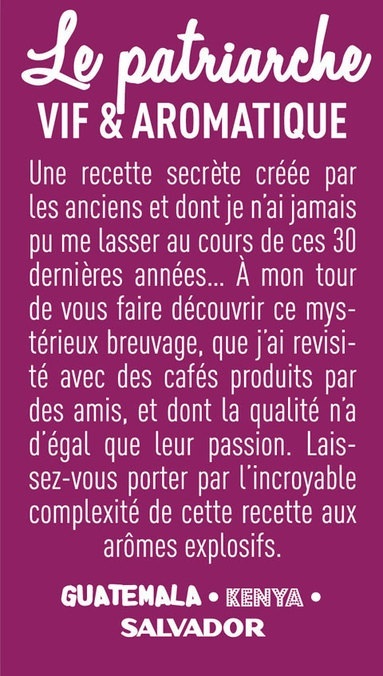 'Le Patriarche' is a blend of grands crus Arabica coffee beans from Guatemala, Kenya and Salvador. For a balanced aromatic coffee. Assembled and roasted by French artisan roasters Cafés Tchanqué. Awarded 2018 Best Espresso Blend in France by the French coffee committee. 1kg coffee beans.