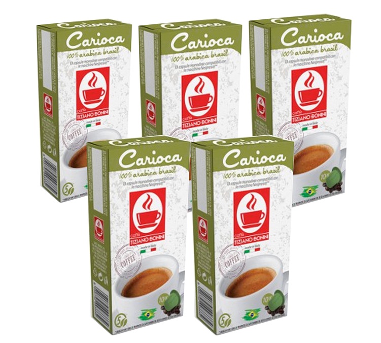 Discover these Carioca capsules by Caffè Bonini. 100% Arabica from Brazil for a silky espresso with cocoa notes. 5 boxes of 10 Nespresso-compatible capsules from Italy.