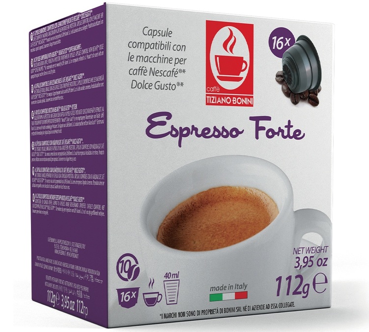 Discover Caffè Bonini Dolce Gusto* pods Espresso Forte for a strong and powerful espresso. These pods are compatible with Nescafé* Dolce Gusto* machines. Box of 16 coffee pods.