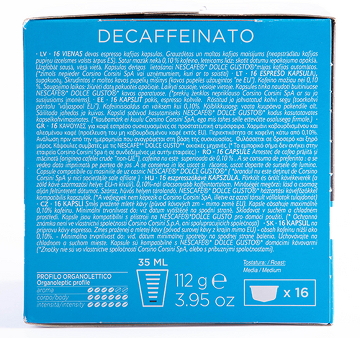 Caffè Corsini Gran Riserva Decaffeinato Nescafé* Dolce Gusto* pods: For a decaffeinated balanced espresso. A blend of Arabica & Robusta. Roasted in Italy. 1 box of 16 Nescafé* Dolce Gusto* pods (compatible pods for Dolce Gusto machines).