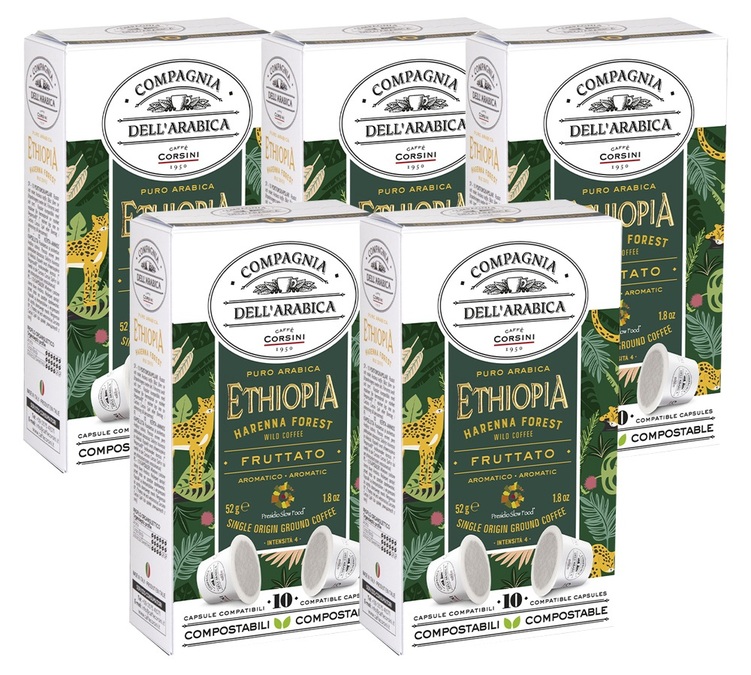 Nespresso* is a registered trademark owned by a third party and has no connection with MaxiCoffee. Caffè Corsini Harenna Wild Forest Ethiopia Nespresso pods. For a strong and aromatic coffee coffee with a definite taste that makes it especially pleasing after meals. A medium roast with citrus and floral notes. Roasted in Italy. 5 boxes of 10 Nespresso-compatible capsules.