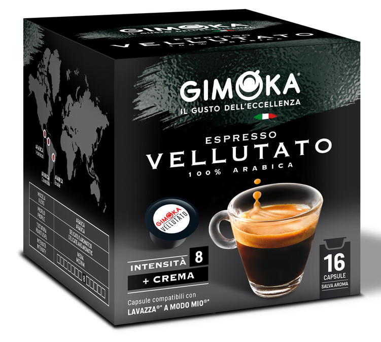 Discover these A Modo Mio compatible Vellutato capsules from Gimoka. Let yourself be seduced by its full body and notes of fruit and chocolate. This 100% arabica coffee is the blend of arabica from South and Central America. Packaging: 1 box of 16 capsules