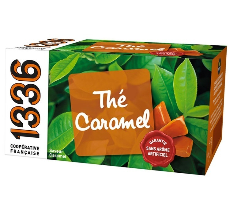 Box of 20 chiffon tea bags of Caramel black tea from 1336, a brand launched by SCOP TI in France. A 100% natural tasty tea recipe.