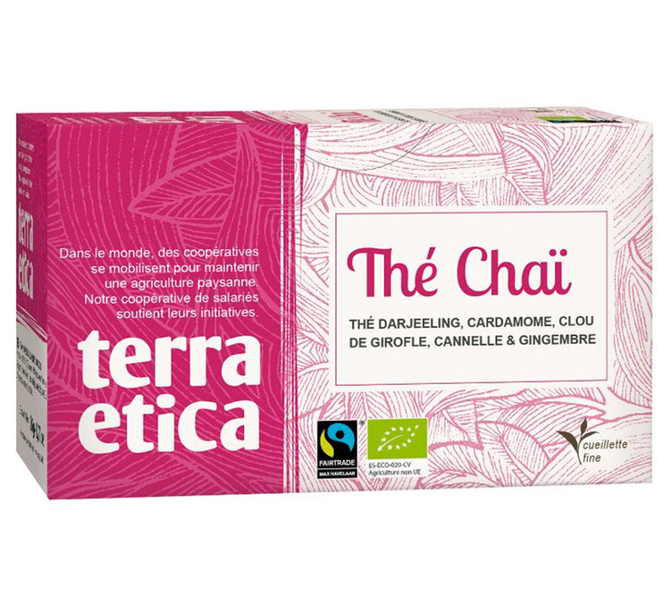 Chai black tea by Terra Etica : Darjeeling black tea with mild spices, cinnamon, cloves and ginger. Perfect for an energy boost in the morning! Best enjoyed with a drop of milk and a bit of sugar. Box of 20 sachets. Organic and Fairtrade product.