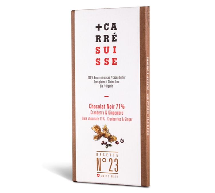 Delicious organic 71% extra dark chocolate bar with cranberry and ginger from Carré Suisse. Contents 100g. 100% cocoa butter, gluten free