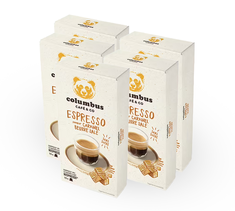 Salted Butter Caramel flavoured coffee pods by Columbus Café & Co. Compatible with Nespresso* Original. This salted butter caramel espresso recipe will seduce you for sure! 100% airtight capsules, no unnecessary packaging. 5 boxes of 10 capsules.