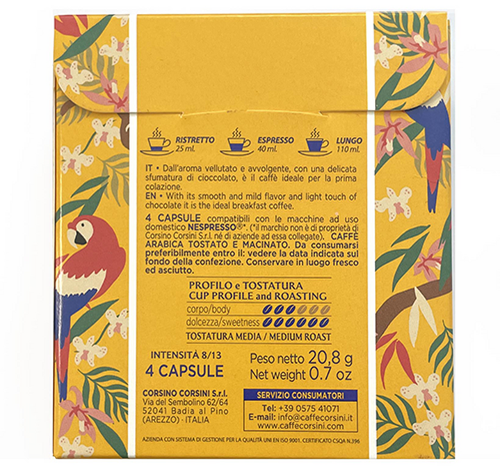 Discover this 100% Arabica coffee from Corsini in a special Christmas edition! Discover this pure origin from the Sao Paulo region in Nespresso* Original compatible pods presented in a magnificent Christmas bauble in the colours of Brazil. The bauble contains 4 capsules, and is ideal for putting on the Christmas tree for an original decoration and a rich Christmas.