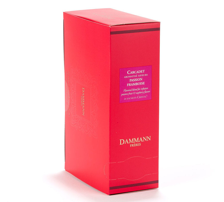 'Carcadet Passion Framboise' by Dammann Frères is a lovely caffeine-free infusion with hibiscus flower, rose hip bark, dried apple pieces, passion fruit and raspberry. 24 individually-wrapped sachets in dispensing box.