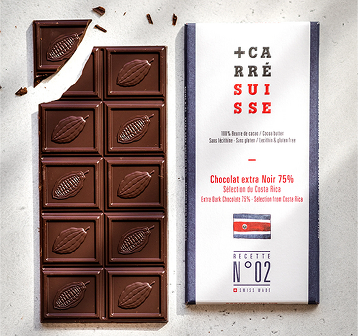 Delicious extra dark chocolate bar with 75% special selection Costa Rica cocoa from Carré Suisse. Contents 100g. 100% cocoa butter, gluten free.