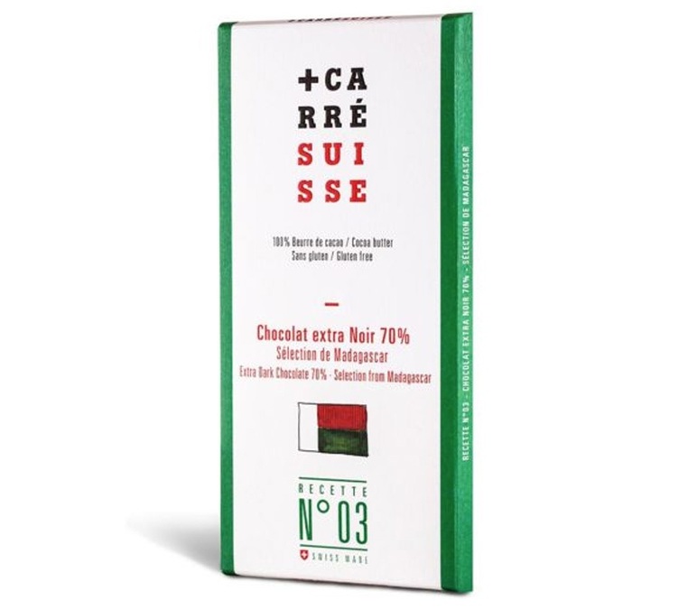 Delicious extra dark chocolate bar with 70% special selection Madagascar cocoa from Carré Suisse. Contents 100g. 100% cocoa butter, gluten free.
