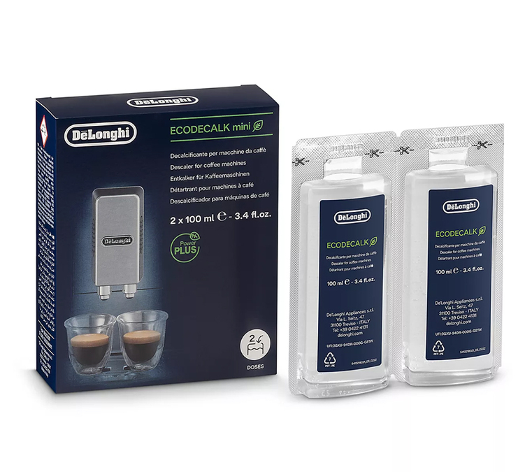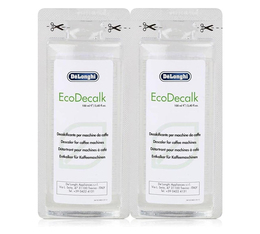 The EcoDecalk descaler from Delonghi is an extremely effective coffee machine descaling product based on natural components that are non-corrosive, non-aggressive and without any danger to the environment. 100ml. Can be used in all coffee machines (bean to cup machines, espresso machines, drip filter coffee machines, capsules machines...). 6 packs of 2x100ml..