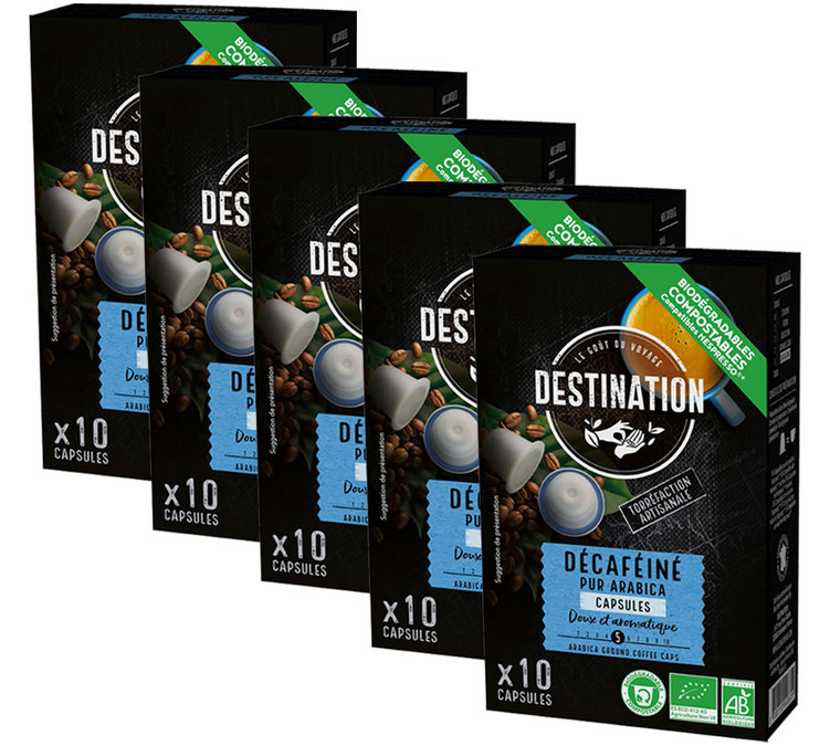 Destination Decaffeinated coffee capsules: 100% organic Arabica decaffeinated using water. For a mild aromatic espresso. Made from biodegradable & compostable wood fiber, guaranteed GMO-free and aluminium-free. 5 boxes of 10 Nespresso-compatible capsules.