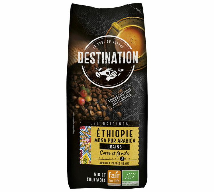 Destination 'Moka Pur Arabica' organic coffee beans: 100% Arabica Moka coffee beans, grown in the Djimmah & Limu regions in Ethiopia. This coffee comes from a rich and distinctive soil. It develops fruity and floral notes with a slight acidity. Very enjoyable! 1kg coffee beans.