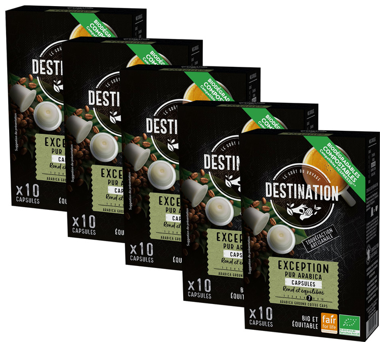 Destination Pure Arabica coffee capsules: 100% organic Arabica for a balanced espresso with toasty notes. Made from biodegradable & compostable wood fiber, guaranteed GMO-free and aluminium-free. 5 boxes of 10 Nespresso compatible capsules.
