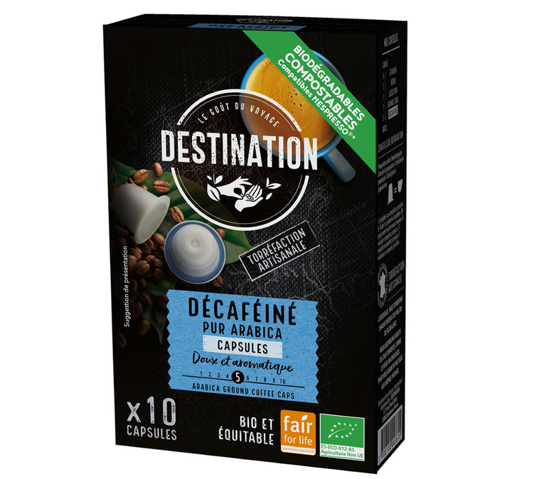 Destination Decaffeinated coffee capsules: 100% organic Arabica decaffeinated using water. For a mild aromatic espresso. Made from biodegradable & compostable wood fiber, guaranteed GMO-free and aluminium-free. 1 box of 10 Nespresso* Original compatible capsules.