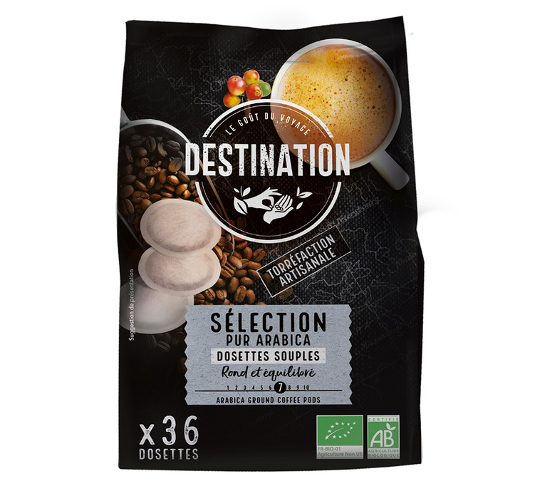 Destination 100% Arabica organic coffee pods for Senseo machines: a blend of 100% Arabica organic coffees. For a balanced coffee. 36 Senseo-compatible coffee pods.