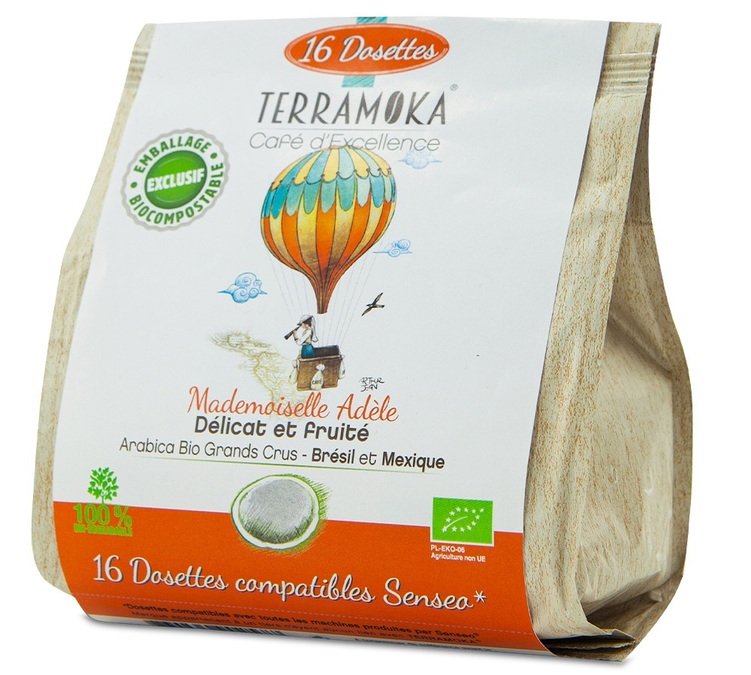 Discover Mademoiselle Adèle coffee beans from Terramoka. A perfect blend of organic Arabica coffee beans from Brazil and Mexico. For a balanced coffee with fruity notes and a delicate after taste. 16 Senseo coffee pods.