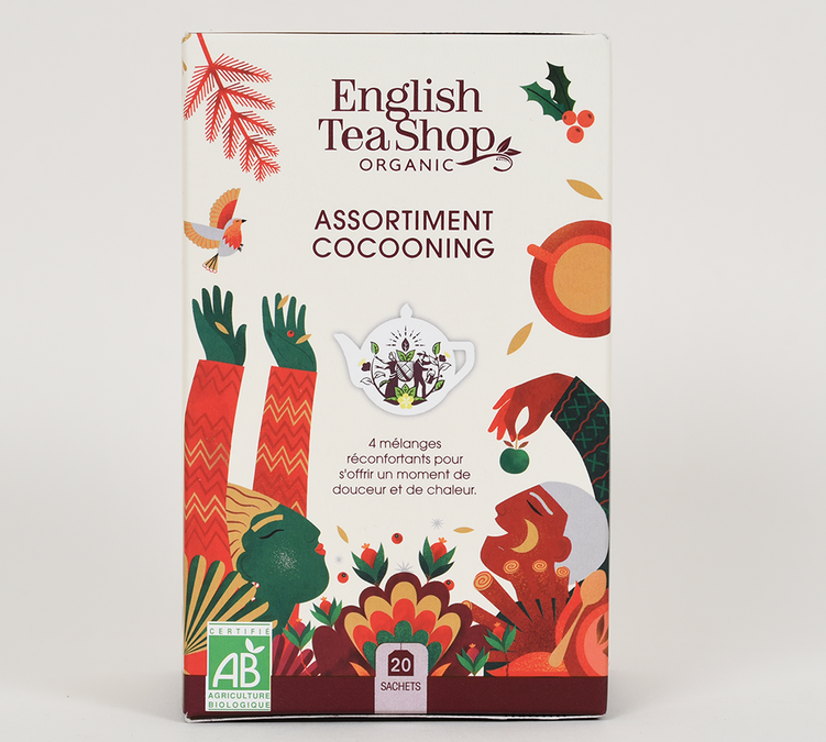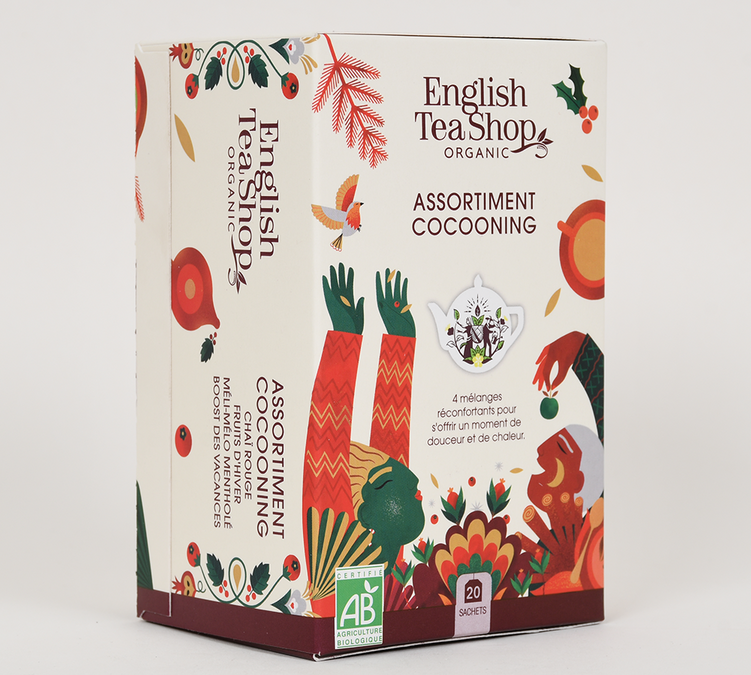Discover Ensligh Tea Shop's Winter Cocooning selection of 20 organic tea bags and infusions. Two black teas, one green tea and an infusion of rosehip and hibiscus await you in this pretty box of tea bags to share this holiday.