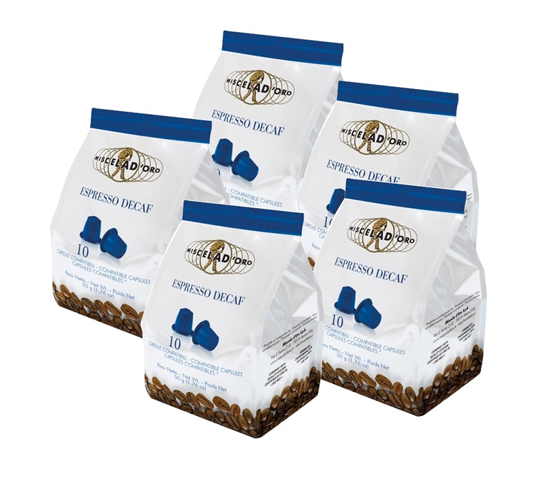 Discover these Decaffeinato capsules by Miscela d'Oro, compatible with Nespresso ®:  A blend of Arabica from South America and Robusta from Asia, decaffeinated with water. 5 packs of 10 airtight capsules (no unnecessary packaging).
