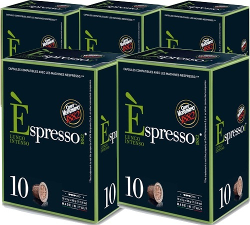 50 x Espresso Lungo Intenso capsules by Caffè Vergnano. It is a balanced blend from the best Arabicas. For a velvety coffee, perfect for breakfast. The capsules are compatible with Nespresso® machines. 5 boxes of 10 individually-wrapped capsules.