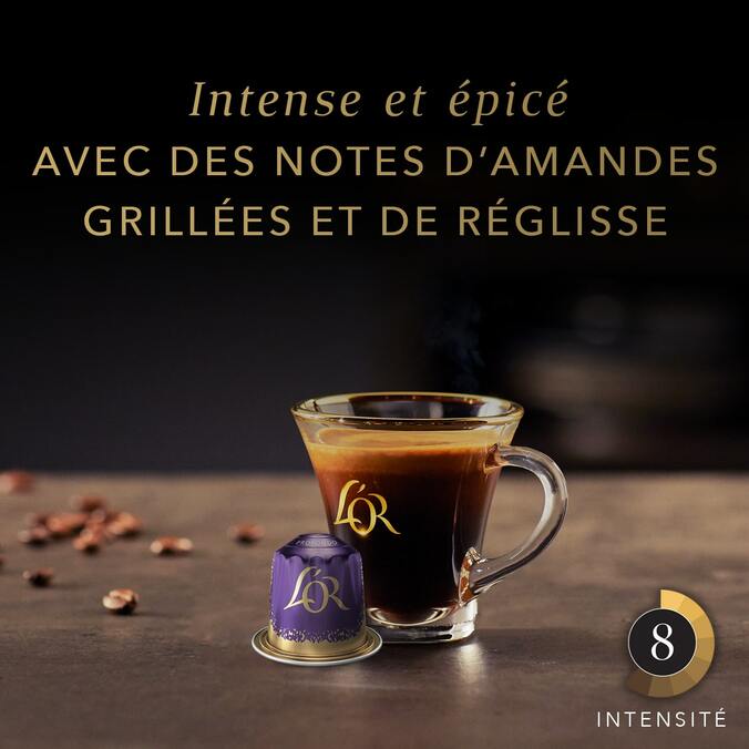 L'Or Espresso's Lungo Profondo comes in a pack of 50 pods (5 boxes of 10) for convenient and economical daily use, either on your own or with friends. This iconic, intense and spicy long coffee reveals notes of toasted almonds and liquorice. With an intensity of 8, it is less strong than a traditional black coffee, offering a pleasant and easy tasting experience. The pods are compatible with Nespresso* Original and L'Or Barista® machines, ensuring quick and effortless preparation of a delicious coffee in every cup.