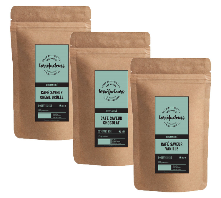 Discover this selection pack of flavoured coffees containing 150 ESE pods, compatible with espresso machines accepting ESE pods. This pack contains three flavours of coffee, which vary according to our latest arrivals (50 pods of each flavour). Vanilla, Crème Brûlée, Chocolate, etc. Only available on MaxiCoffee! Made in France.