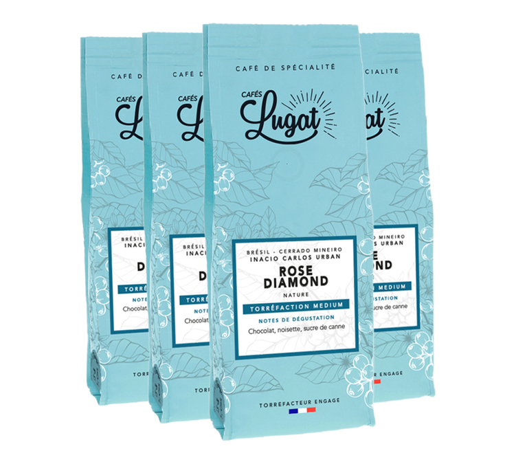 Succumb to the savoir-faire of Cafés Lugat with Rose Diamond ground coffee, a real invitation to explore the richness of Brazil's terroir.
