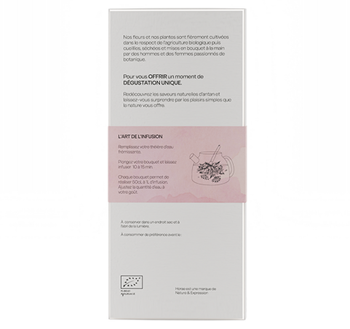 Horae is a French brand of organic herbal tea whose teams are made up of passionate botanists. Each flower is grown on a family farm and harvested according to a biodynamic calendar. The flowers are dried naturally before being assembled by hand by the Horae teams to form these flowering tea bulbs. The composition of each bulb is designed to bring together the different flavours to create an explosion of flavour on the palate.