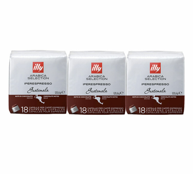 Illy Guatemala Iperespresso capsules compatible with domestic Iperespresso machines (X7.1 - Y1.1 Touch - Y5 - Y3 - X8 - Gaggia Iperespresso). This pure origin coffee from Guatemala is characterised by a balanced taste, with notes of chocolate followed by seductive aromas of caramel, citrus fruits and honey.. 3 boxes of 18 Illy capsules.