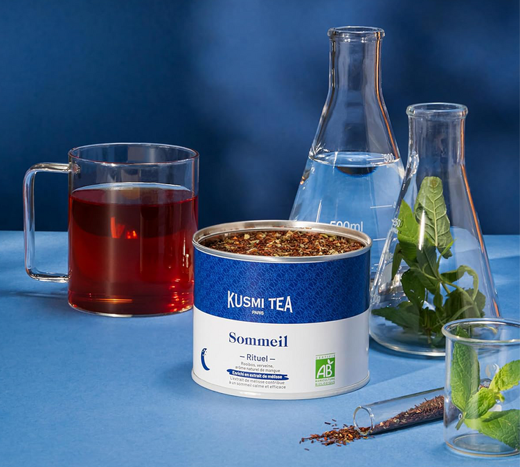 Sleep Ritual Tea by Kusmi tea is an organic herbal tea with a base of rooibos, verbena leaves and lemon balm extract. It contains no theine, which promotes relaxation and makes it easier to fall asleep.