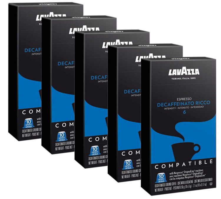 Lavazza Espresso Decaffeinato Ricco is a blend of Arabica & Robusta, roasted in Italy. For a balanced decaffeinated espresso with a round syrupy body. Decaffeinated using solvents. 5 boxes of 10 Nespresso-compatible capsules.