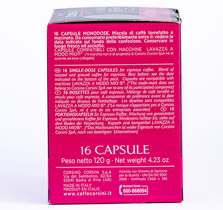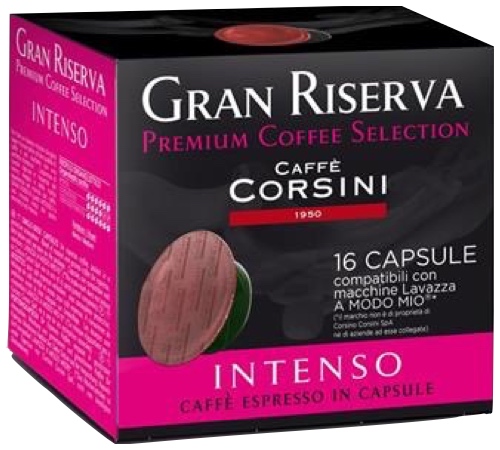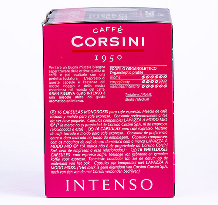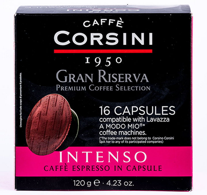 Caffè Corsini "Gran Riserva Intenso": For a very strong creamy espresso. A blend of Arabica & Robusta. Roasted in Italy. 1 box of 16 Lavazza A Modo Mio compatible capsules.