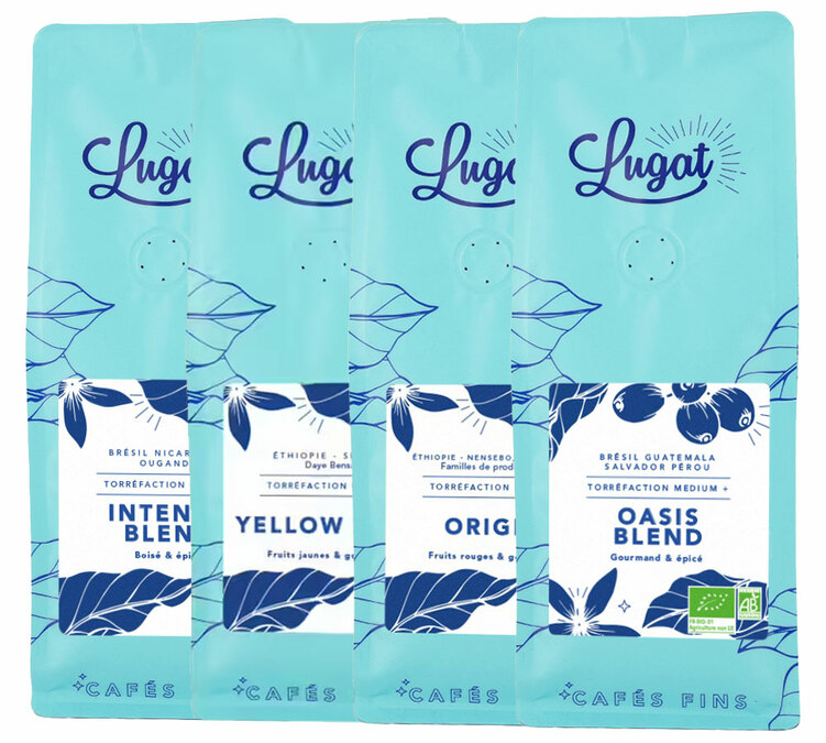 Discover the ‘espresso tasting selection’, comprising four varieties of coffee beans from Lugat, at a dark roast and ideal for making your espresso. You’ll find four 250g packs, perfect for trying out different coffees whilst maximising your chances of finding the one that suits you best. Arabica and Robusta and freshly roasted, these exceptional coffee beans promise you an optimal and satisfying coffee experience.