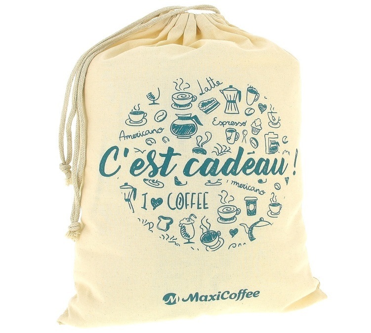 MaxiCoffee cotton bag with straps. "C'est cadeau" (Here is a gift!). A lovely reusable bag! 100% cotton.  L 29cm x H 43,5cm. With 2 cotton straps to tighten the top of your bag. Ideal to hide all your present inside this Xmas!