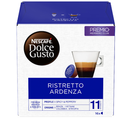 Nescafé* Dolce Gusto* pods Ristretto Ardenza: a blend of dark-roasted Arabica & Robusta for a very strong espresso with spicy, peppery notes. 1 box of 16 Dolce Gusto* pods.