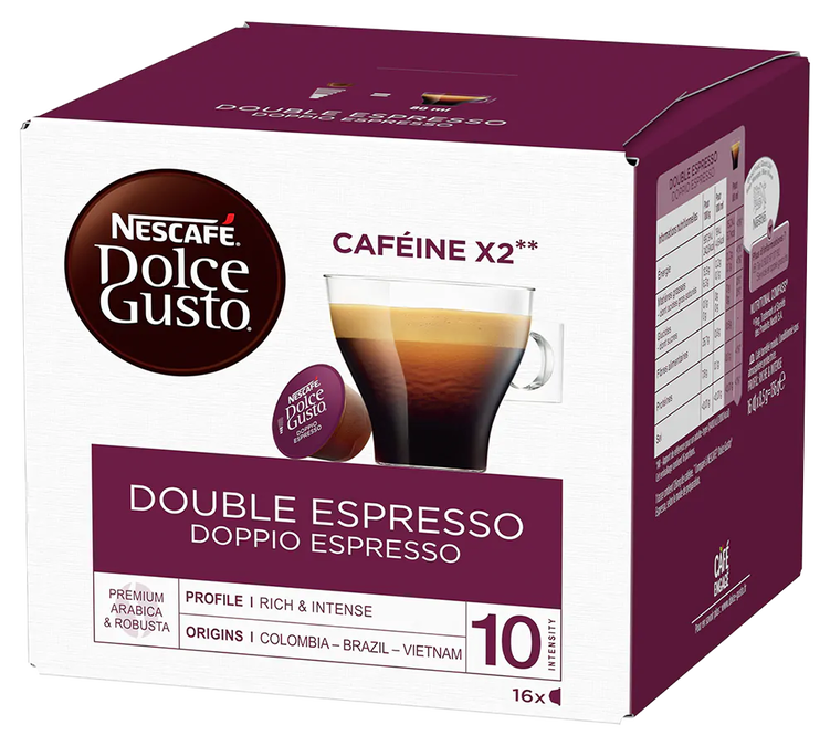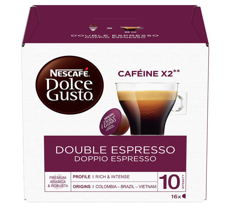 Discover these 16 Nescafé* DOLCE GUSTO* pods: a double espresso with a bold flavour enhanced by caramel notes.  Stay energised all day long with the double dose of caffeine in this hot drink.