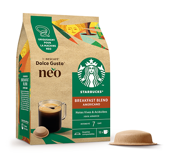 Lovers of medium roasts, start your day with a big cup of richly flavoured coffee. The Starbucks Breakfast Blend pod is both mild and balanced, and rich in character. This tall cup offers bright notes of yellow fruit, citrus and wine - providing a lovely acidity on the palate, which rounds out at the mouthfeel. And if you prefer a more conventional roast, discover the whole range of Nescafé® Dolce Gusto® pods.